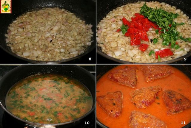 8.- En una cazuela o sartén ponemos un chorrito de aceite. Cuando esté caliente ponemos a freír un diente de ajo y una cebolla roja, bien picado. Salamos ligeramente. 9.- Cuando empiece a coger color añadimos 2 pimientos partidos en trozos y una rama de perejil. 10.- Regamos con caldo de pescado y dejamos que se haga la salsa quince minutos. Si vemos que queda muy ligera ponemos en una taza una cucharada sopera de maizena y diluimos con un poco de caldo de pescado frío, revolviendo para que no queden grumos. Lo añadimos a la mezcla que estamos haciendo para el relleno. Dejamos que se haga todo junto 3 minutos. 11.- Colocamos en un vaso de batidora. Batimos bien y regamos con esta salsa los pimientos que tenemos en la cazuela.