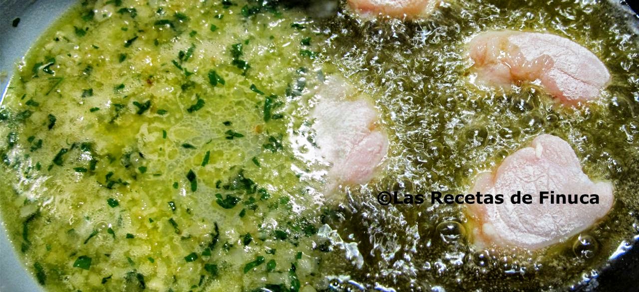 Limpiamos la cazuela en que hemos abierto las almejas. Cubrimos el fondo con aceite y a fuego bajo (en una vitrocerámica del 1 al 9, en el número 4) hacemos el refrito con una cebolla y un diente de ajo, picado pequeño. Salamos ligeramente y revolvemos de vez en cuando hasta que la cebolla esté bien transparente. Echamos abundante perejil picado y una cucharada, tamaño postre, de harina. Revolvemos. Añadimos caldo del que hemos preparado hasta conseguir una salsa espesa a nuestro gusto. Mientras, en una sartén ponemos aceite a calentar, salamos el rape, lo pasamos por harina y, con el aceite bien caliente, lo freímos. Vuelta y vuelta para crear una costra exterior pero que nos quede jugoso por dentro. Lo colocamos sobre la salsa verde que hemos preparado.